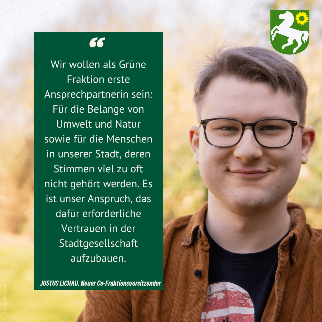 Auch Justus Lichau, ebenfalls neuer Co-Fraktionsvorsitzender, betont den Aufbruch: „Wir haben uns bewusst dafür entschieden, Strukturen und Abläufe zu modernisieren und neue Schwerpunkte zu setzen. Wir wollen als Grüne Fraktion erste Ansprechpartnerin sein: Für die Belange von Umwelt und Natur sowie für die Menschen in unserer Stadt, deren Stimmen viel zu oft nicht gehört werden. Es ist unser Anspruch, das dafür erforderliche Vertrauen in der Stadtgesellschaft aufzubauen.“