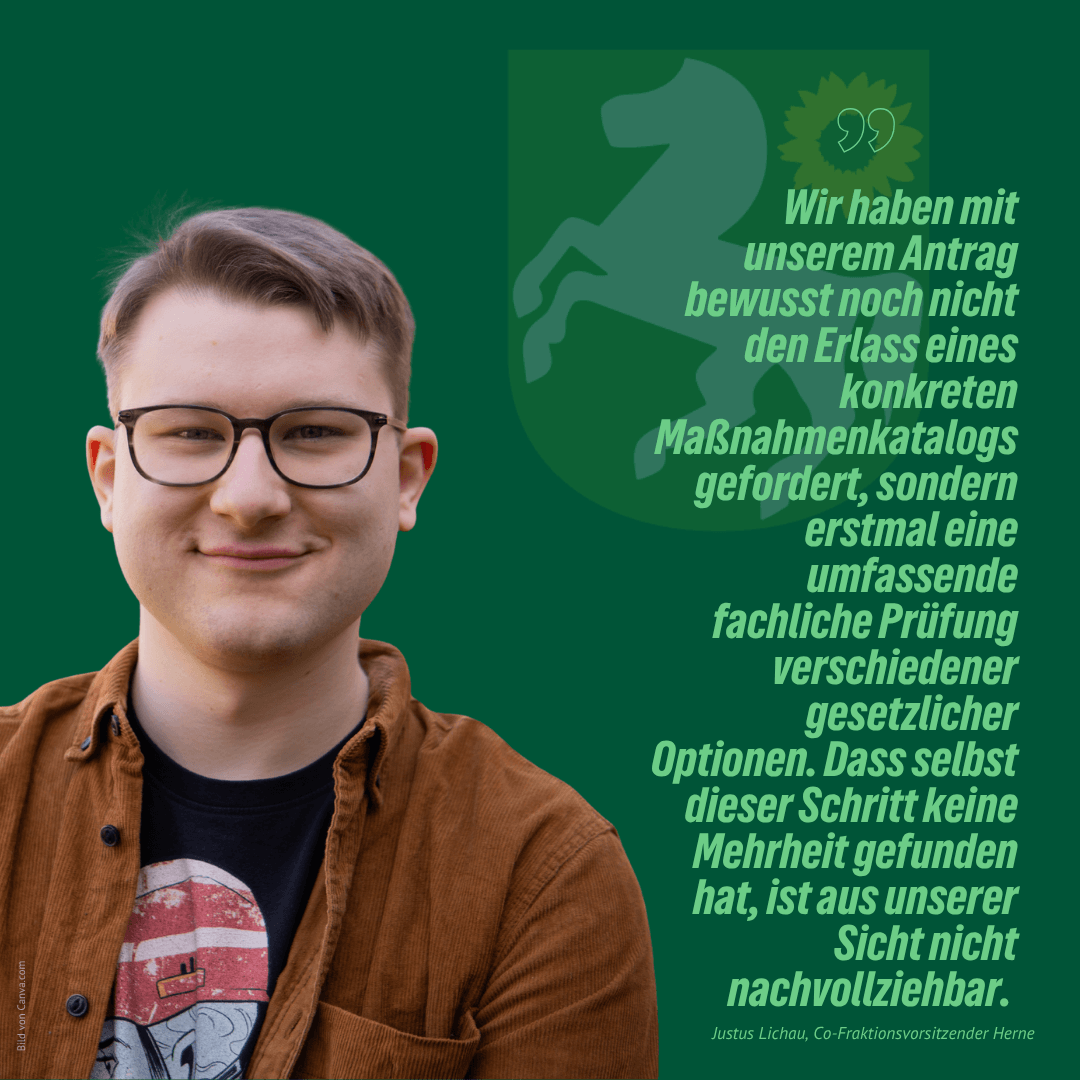„Wir haben mit unserem Antrag bewusst noch nicht den Erlass eines konkreten Maßnahmenkatalogs gefordert, sondern erstmal eine umfassende fachliche Prüfung verschiedener gesetzlicher Optionen. Dass selbst dieser Schritt keine Mehrheit gefunden hat, ist aus unserer Sicht nicht nachvollziehbar“, erklärt der Co-Fraktionsvorsitzende Justus Lichau.